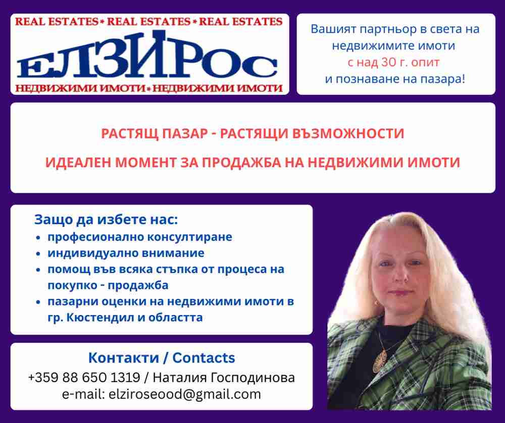 🍀С над 30 години опит и познаване на пазара, ние предлагаме професионално консултиране, индивидуално внимание и помощ във всяка стъпка от процеса на покупко-продажба на недвижими имоти в гр. Кюстендил и областта.